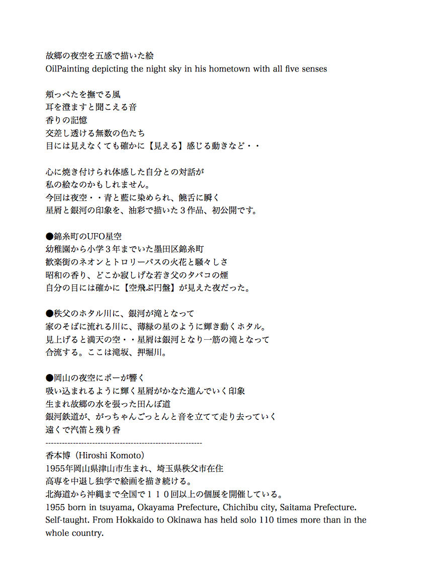 香本博「UFOとトロリーバス夜空」(キャンバスに油絵の具)38x46cm【¥19,000】(額無し) 滝田好子「至向の掲示」(キャンバスにアクリル)20x60cm4枚組各【¥30,000】 服部百合子「Leaf of lotus (大)」(陶器)37x27x12cm【¥40,000】 「会場風景」